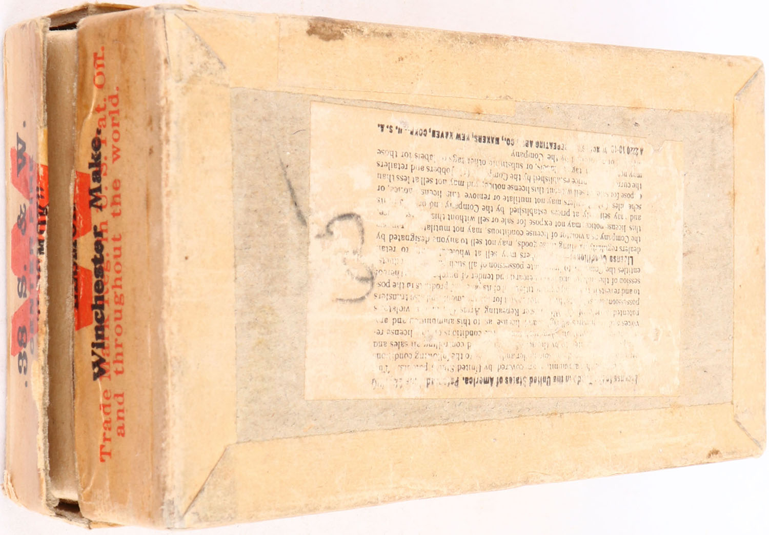 Winchester, .38 Caliber Cartridges, ''Lesmok'' Powder, 145 Gr. Bullets, Partial 35rds. 2pc. Buff box with buff top & side sealing labels, box is solid with very good to excellent color, some age soiling & shelf wear, vertical seam splits to all corners of lids, some edge & corner wear, labels are intact, ammo is very good. Grade: Very Good + - Value: 20 to 80