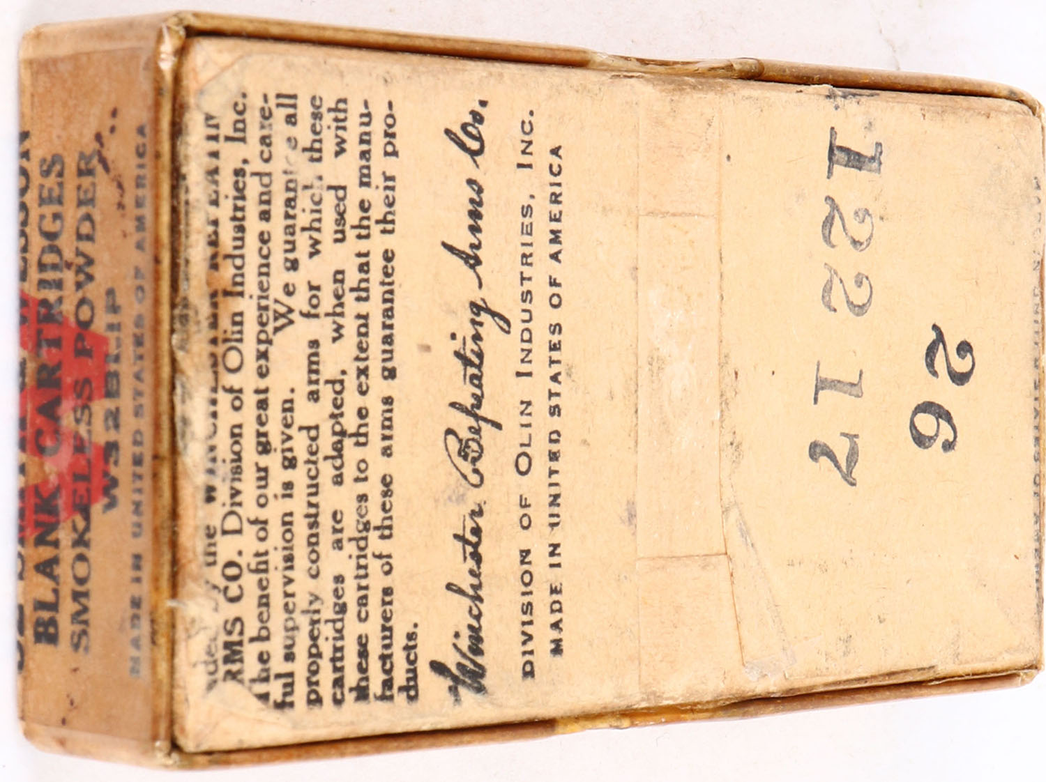 Winchester, .32 Smith & Wesson Blank Cartridges, Full, 2pc. Buff box with buff wraparound label, box is solid with excellent color, minor age soiling, very minor corner wear, some edge wear, all sides and ends are wrapped in tape on top and bottom of box, top has been written on, label is intact, ammo is excellent. Grade: Excellent - Value: 10 to 50