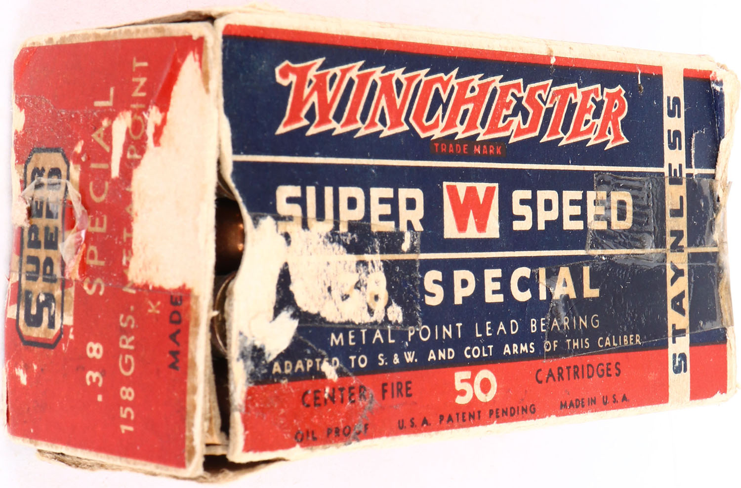 Winchester, Super Speed, .38 Special, 158 Grs. Metal Point, Full, 1pc. Blue red & white box, box has very good to excellent color, left end flap is torn off, minor age soiling, tape damage to top left end and bottom, tape on top right end & bottom, edge & corner wear, ammo is excellent. Grade: Good ++ - Value: 50 to 300