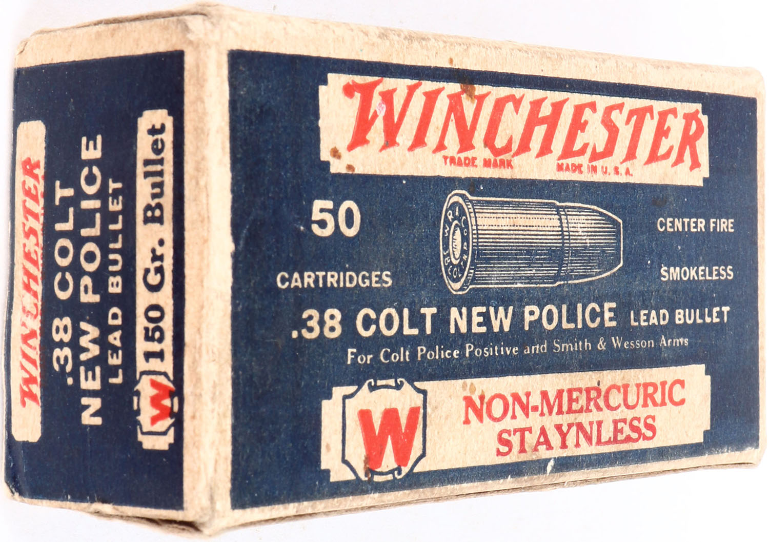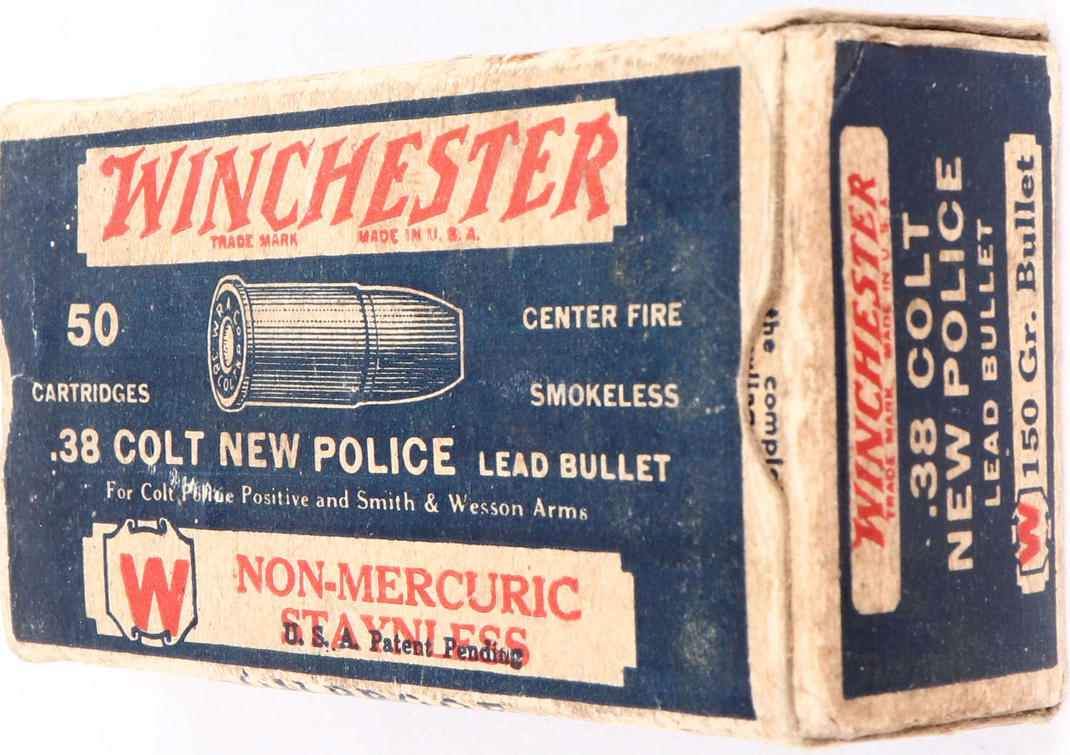 Winchester, Non-Mercuric Staynless, .38 Colt New Police, 150 Gr. Lead Bullet, Full, 1pc. Blue white & red box, box is solid with very good color, age soiling, minor edge & corner wear, end flaps are solid, ammo is excellent. Grade: Excellent - Value: 20 to 60