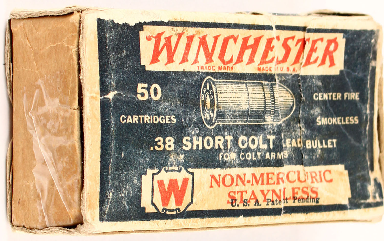 Winchester, Non-Mercuric Staynless, .38 Short Colt, Partial 16rds. 1pc. Blue white & red box, box is missing both end flaps, tear in top, age soiling corner wear, edge wear, shelf wear, ammo is excellent. Grade: Good - Value: 6 to 30