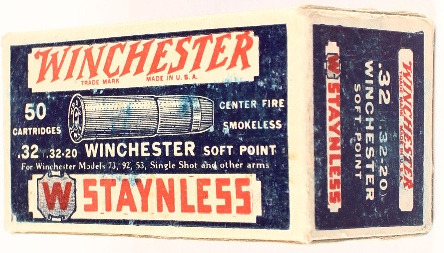 Winchester, Staynless, .32 Winchester (.32-20), Soft Point, Full, 1pc. Blue white & red box, box is solid with excellent color, only minor shelf wear, minor corner wear, edges are mostly crisp, end flaps are solid, ammo is excellent. Grade: Excellent + - Value: 100 to 200