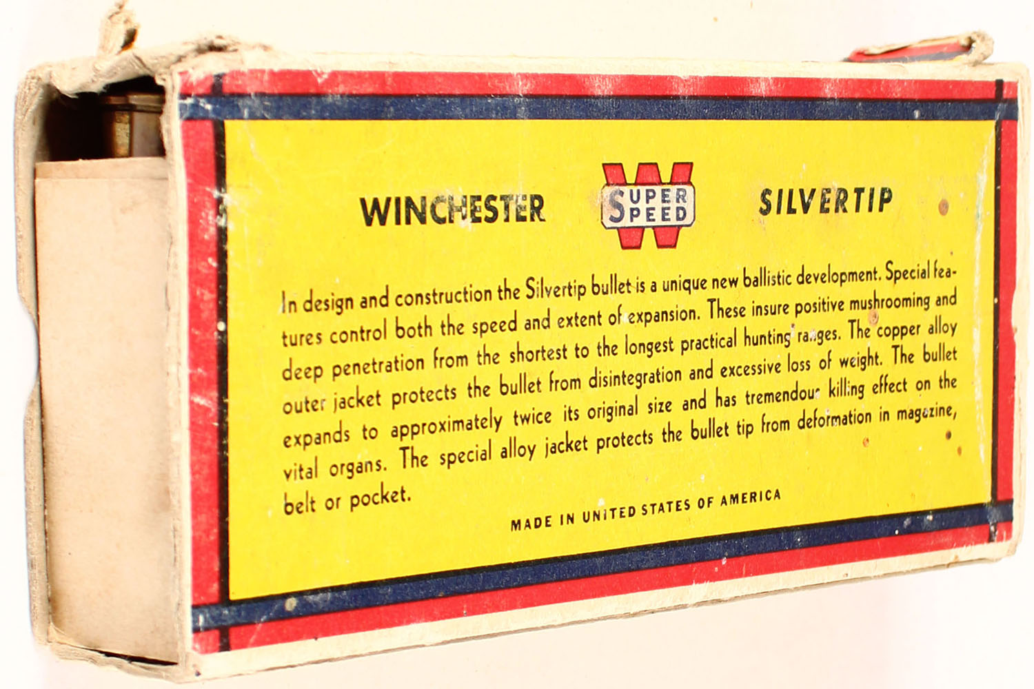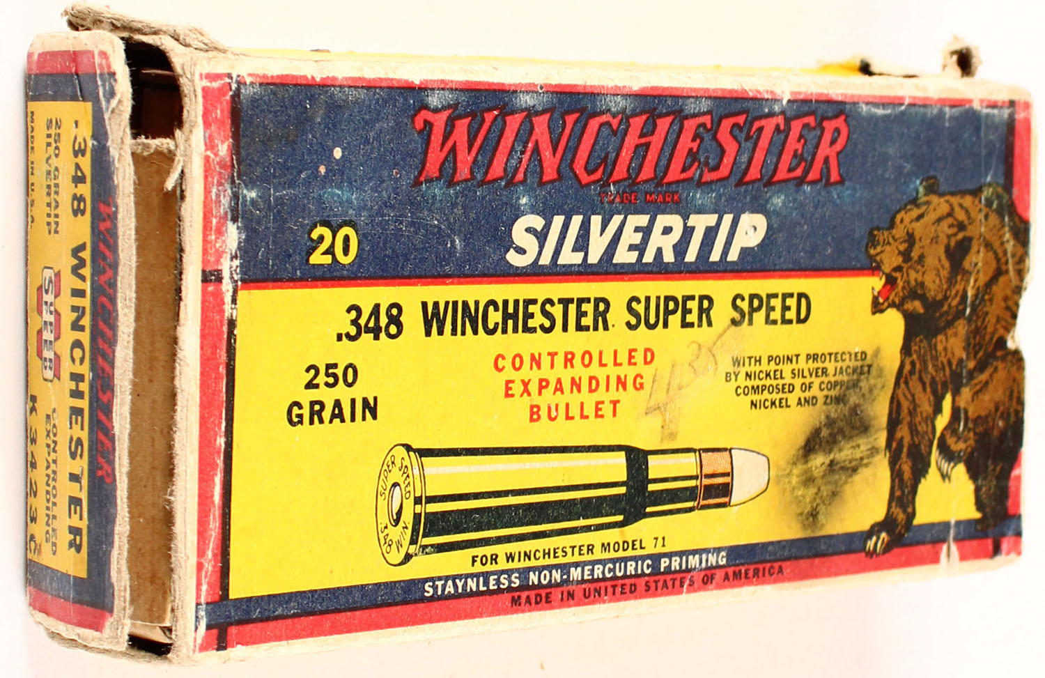 Winchester, Silvertip, .348 Winchester, 250 Grain Controlled Expanding Bullet, Full, 1pc. Yellow blue & red bear box, box is missing right end flap, left end flap is torn, very good color, some age soiling, minor shelf wear, some edge & corner wear, top has been written on, stain on top, ammo is excellent. Grade: Good ++ - Value: 20 to 80