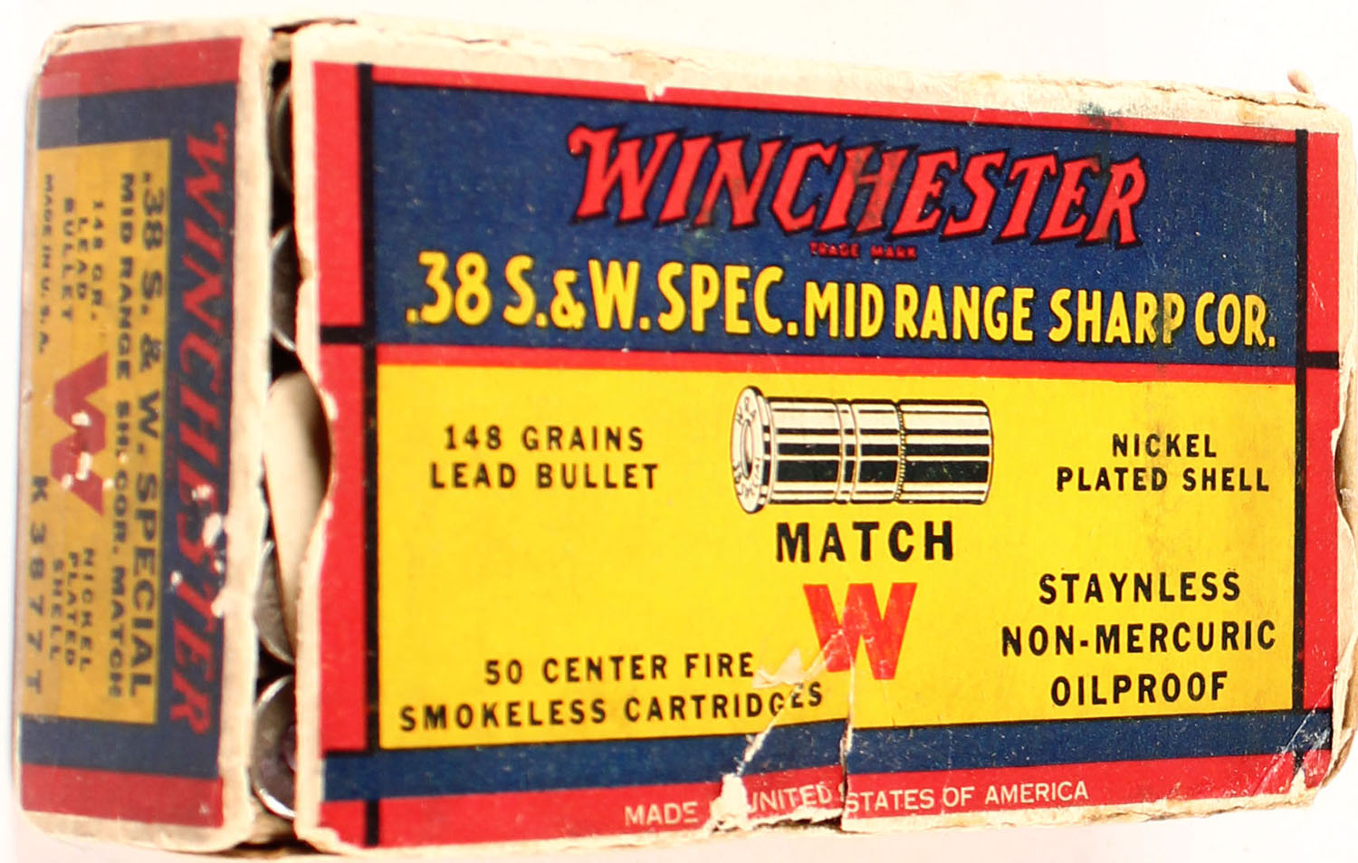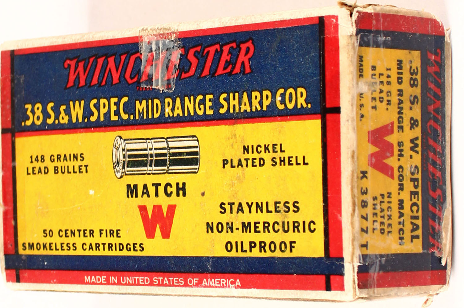 Winchester, Super Speed Match .38 Smith & Wesson Special Mid Range Sharp Cor., 148 Grain Lead Bullet, Nickel Plated Shell, Full, 1pc. Yellow blue & red box, box has several seam splits that have neem repaired, minor age soiling, edge & corner wear, both end flaps have torn insert tabs, ammo is excellent. Grade: Good + - Value: 20 to 100