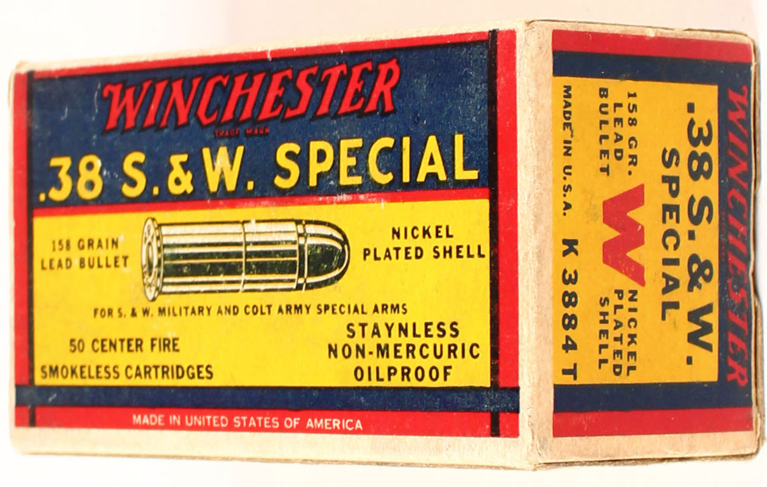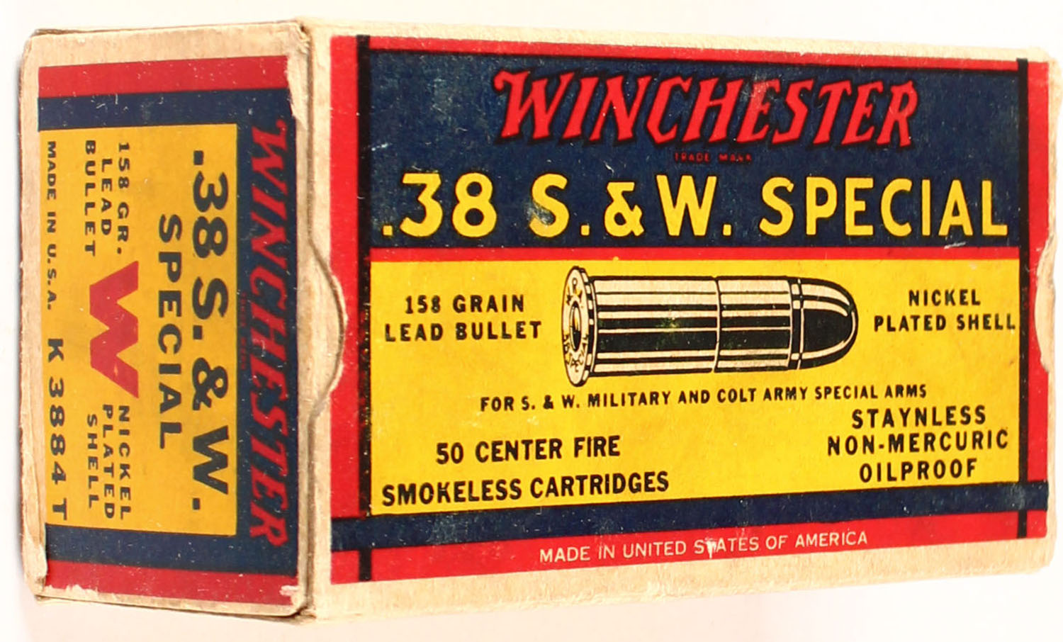 Winchester, Super Speed, .38 Smith & Wesson Special, 158 Grain Lead Bullet, Nickel Plated Shell, Full, 1pc. Yellow blue & red box, box is solid with very good to excellent color, minor age soiling, some corner wear, edges are mostly crisp, end flaps are solid, ammo is excellent. Grade: Excellent + - Value: 20 to 60