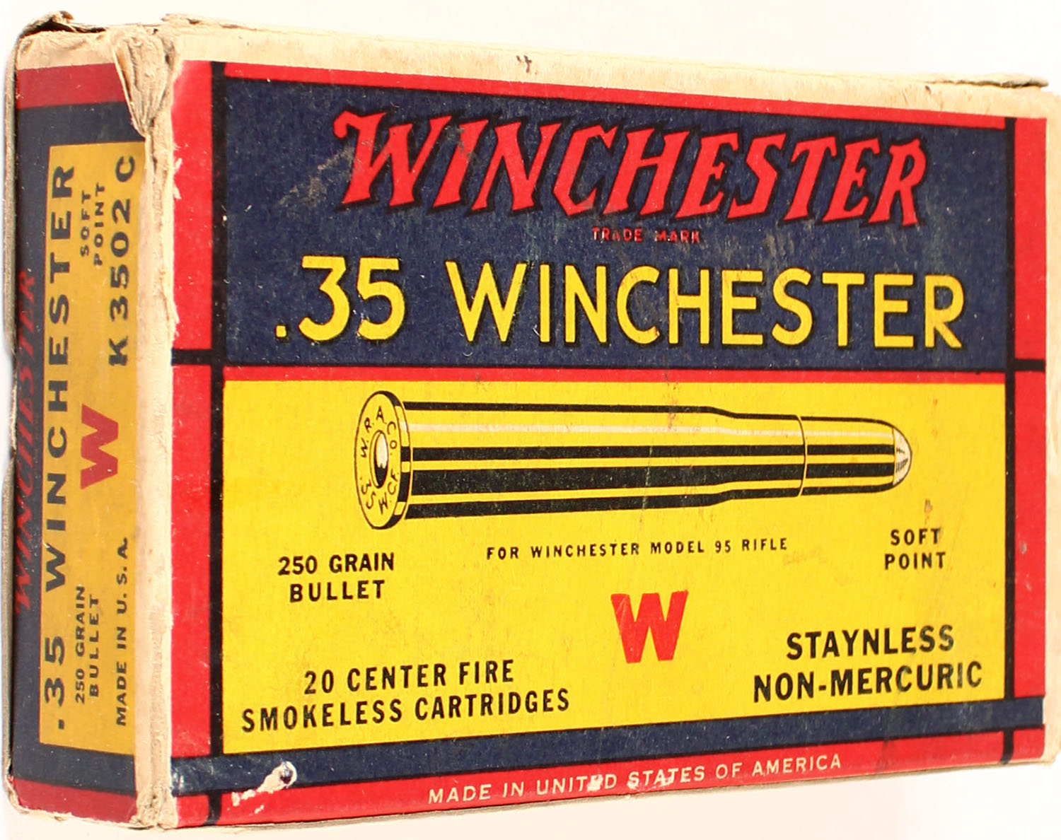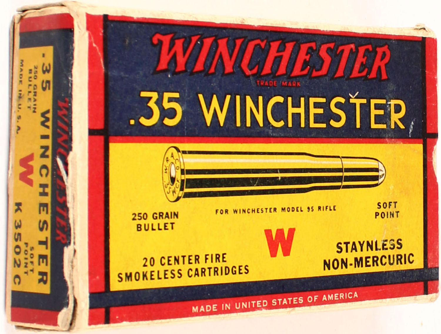 Winchester, .35 Winchester, 250 Grain Soft Point Bullet, Full, 1pc. Yellow blue & red box, box is solid with very good to excellent color, minor age soiling & shelf wear, some edge & corner wear, end flaps are solid, ammo is very good. Grade: Excellent - Value: 50 to 150