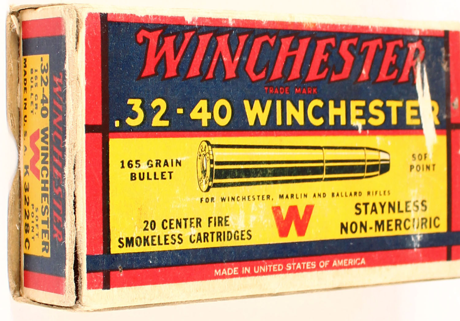 Winchester, .32-40 Winchester, 165 Grain Soft Point Bullet, Partial 18rds., 1pc. Yellow blue & red box, both end flaps are torn , box has excellent color, with minor age soiling, some shelf wear, minor edge & corner wear, ammo is excellent. Grade: Very Good + - Value: 30 to 90