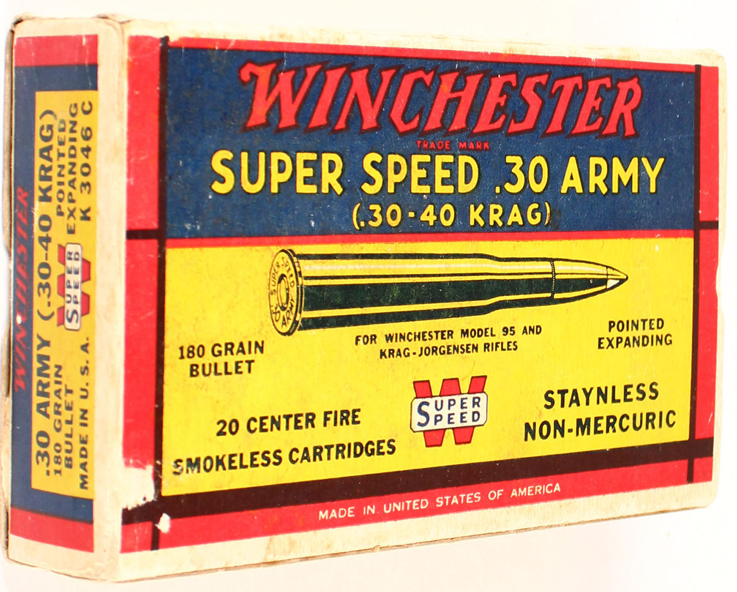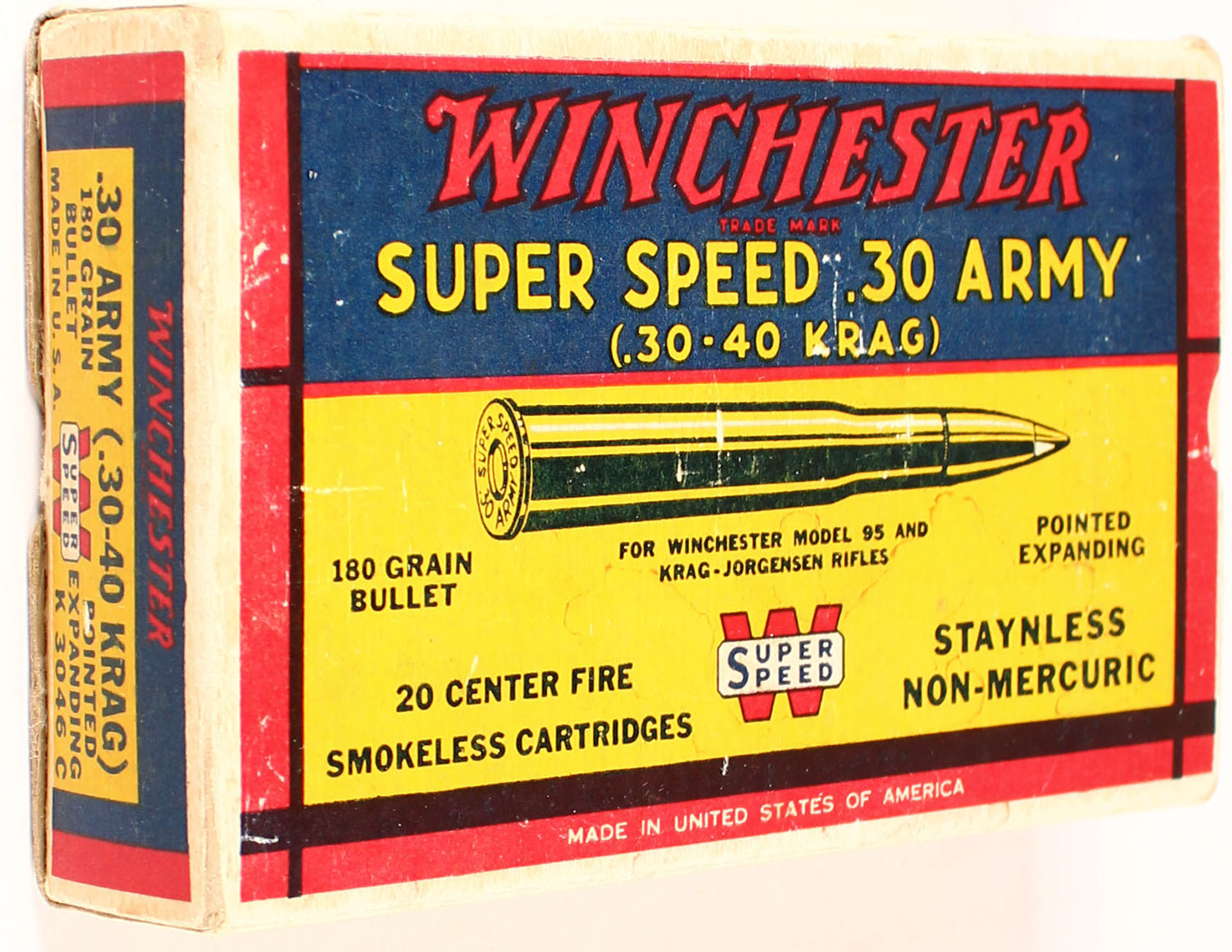 Winchester, Super Speed, .30 Army (30-40 Krag), 180 Grain Pointed Expanding Bullet, Full, 1pc. Yellow blue & red box, box is solid with excellent color, minor age soiling & corner wear, very minor shelf wear, edges are mostly crisp, end flaps are solid, ammo is very good. Grade: Excellent + - Value: 30 to 90