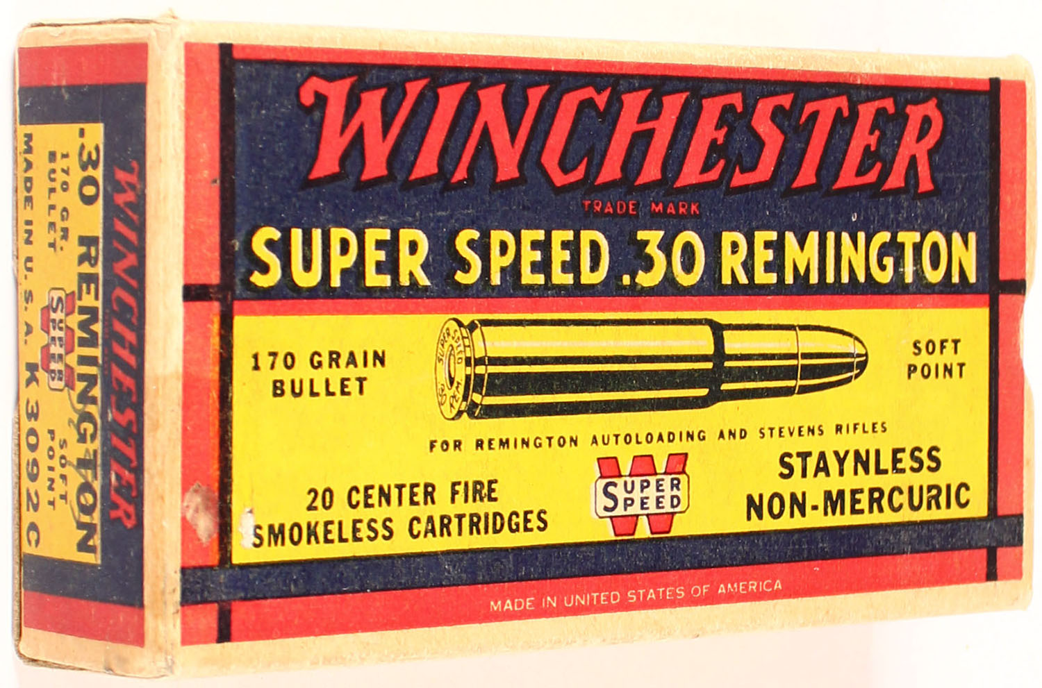 Winchester, Super Speed, .30 Remington, 170 Grain Soft Point Bullet, Full, 1pc. Yellow blue & red box, box is solid with very good to excellent color, some age soiling, small stain on top left end, very minor corner wear, edges are mostly crisp, front has been written on, end flaps are solid, ammo is excellent. Grade: Excellent + - Value: 50 to 150