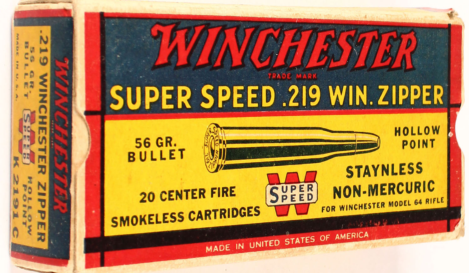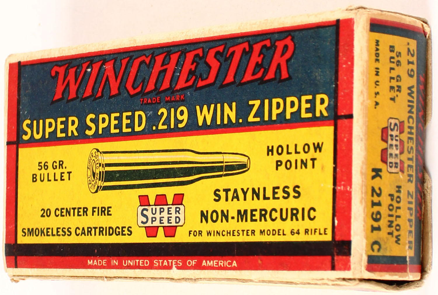 Winchester, Super Speed, .219 Win. Zipper, 56 Grain Hollow Point Bullet, Full, 1pc. Yellow blue & red box, box is solid with excellent color, minor age soiling, partial seam split to bottom back edge, crease to back side, some corner wear, very minor edge wear, end flaps are solid, ammo is excellent. Grade: Excellent + - Value: 200 to 600