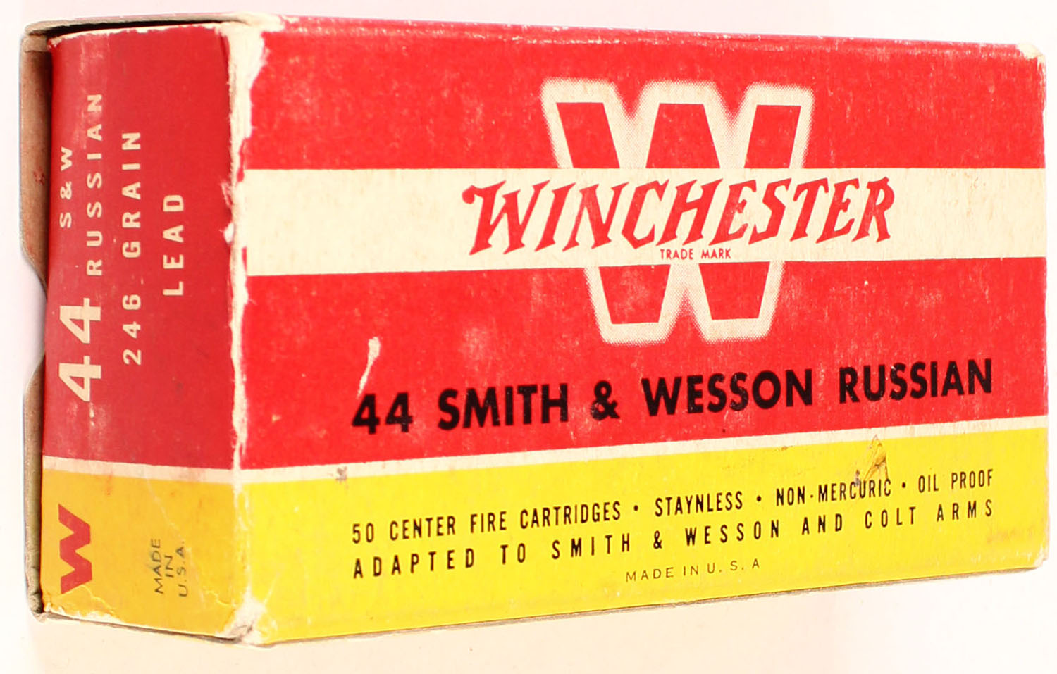 Winchester, .44 Smith & Wesson Russian, 246 Grain Lead Bullet, Full, 1pc. Red yellow & white box, box is solid with excellent color, very minor age soiling, minor shelf wear, very minor corner & edge wear, end flaps are solid, ammo is excellent. Grade: Excellent - Value: 50 to 150