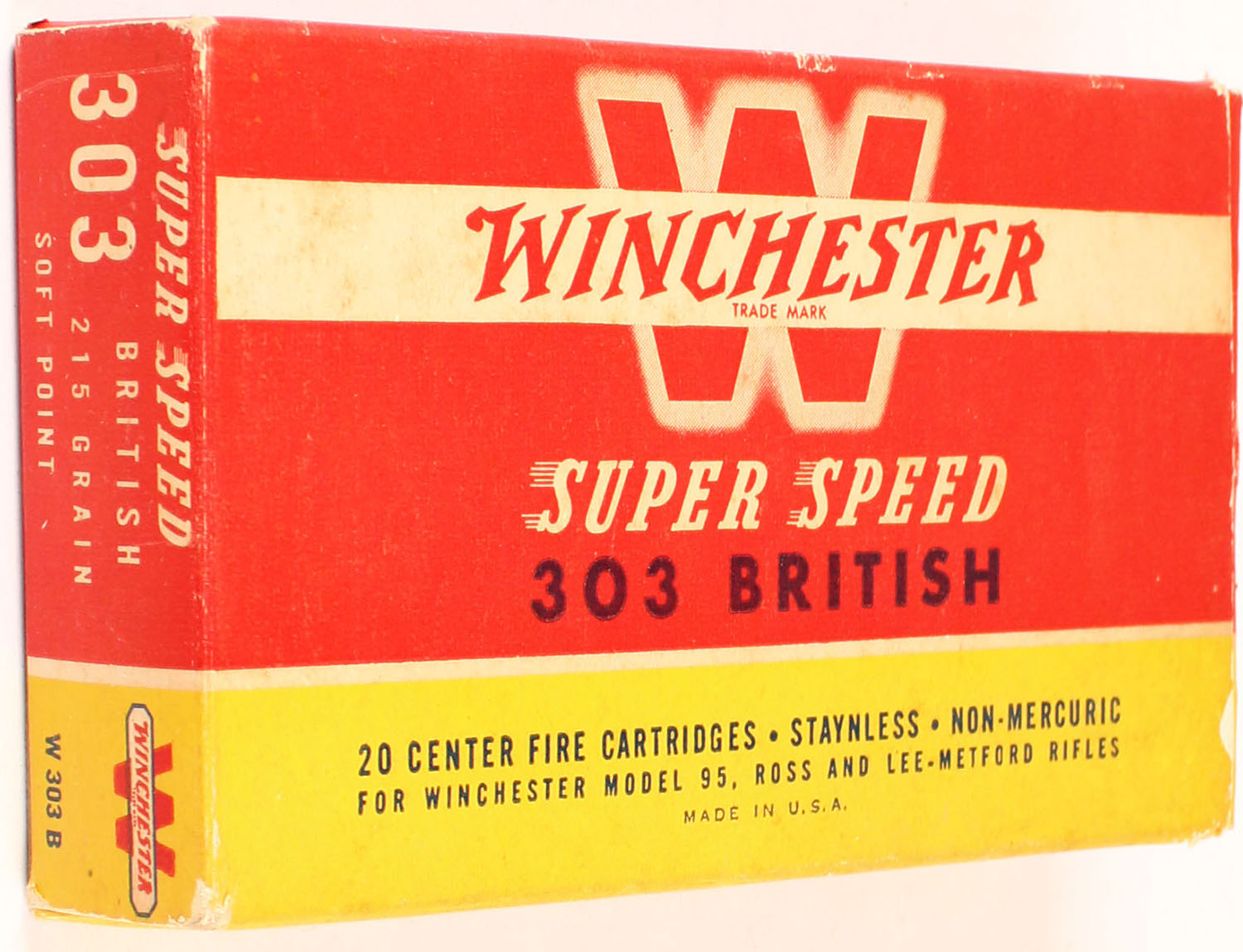 Winchester, Super Speed, .303 British, 215 Grain Soft Point, Full, 1pc. Red yellow & white box, box is solid with excellent color, minor age soiling, very minor corner & edge wear, end flaps are solid, ammo is excellent. Grade: Excellent + - Value: 20 to 60