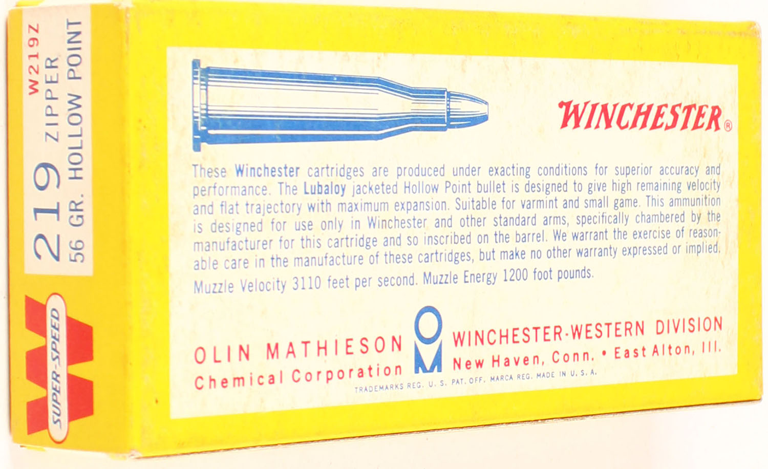 Winchester, Super-Speed, .219 Zipper, 56 Grain Hollow Point, Full, 1pc. Yellow white & red box, box is solid with excellent color, only very minor age soiling & shelf wear, corners are mostly sharp, edges are crisp, end flaps are solid, ammo is excellent. Grade: Excellent ++ - Value: 200 to 600