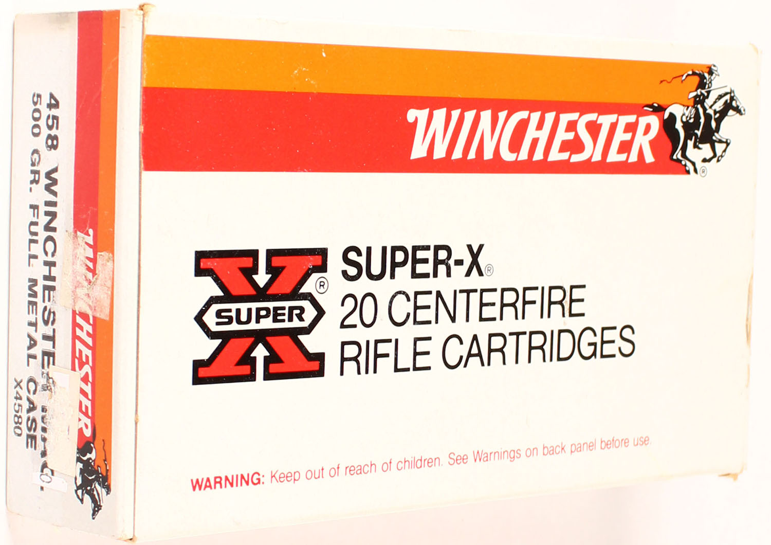 Winchester, Super-X, 458 Winchester Mag, 500 Grain Full Metal Case, Full, 1pc., Multi-colored box, box is solid with great color, Ammo is excellent. Grade: Excellent ++ - Value: 20 to 80