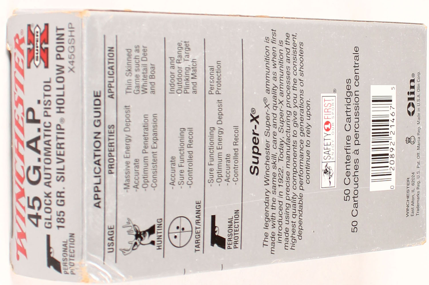 Winchester, Super-X, 45 G.A.P, 185 Grain Silvertip HP, Full, 1pc., Multi-colored box, box is solid with great color, Ammo is excellent. Grade: Excellent ++ - Value: 20 to 80