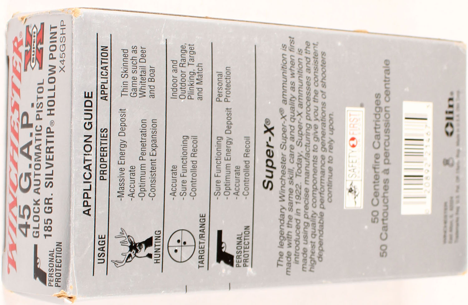 Winchester, Super-X, 45 G.A.P, 185 Grain Silvertip HP, Full, 1pc., Multi-colored box, box is solid with great color, Ammo is excellent. Grade: Excellent ++ - Value: 20 to 80