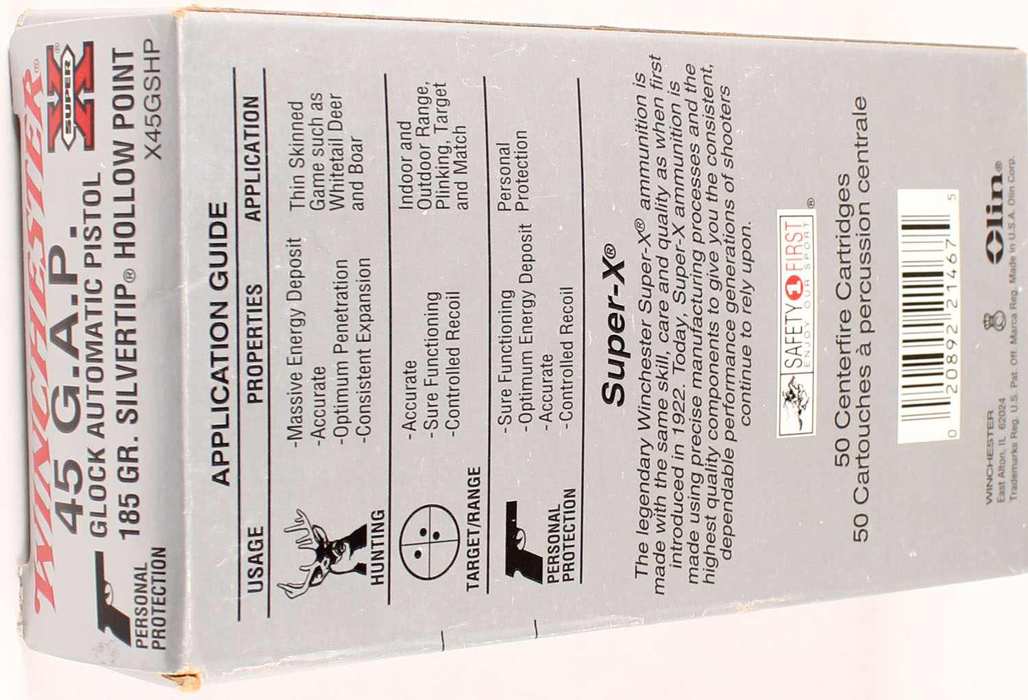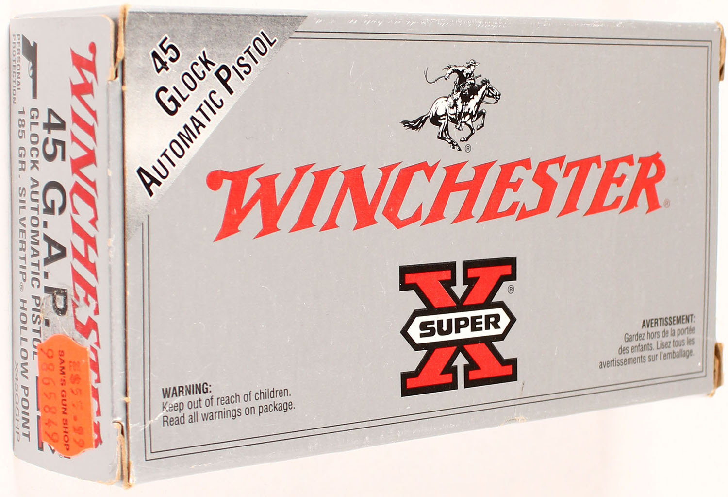 Winchester, Super-X, .45 GAP, 200 Grain SP, Full, 1pc., Multi-colored box, box is solid with great color, Ammo is excellent. Grade: Excellent + - Value: 20 to 80