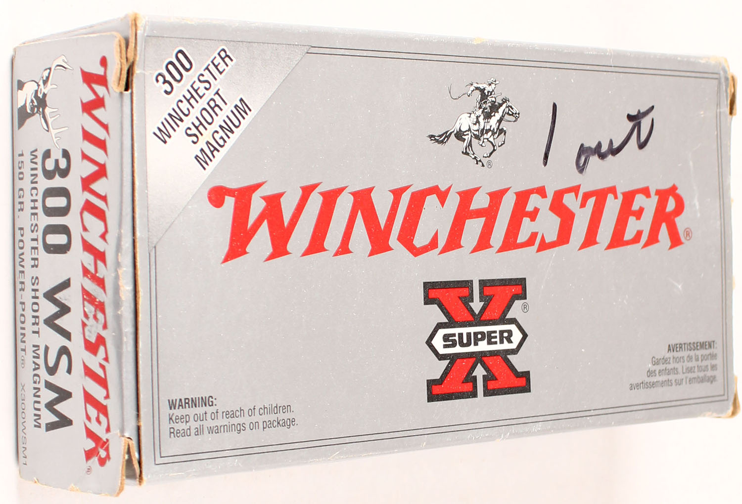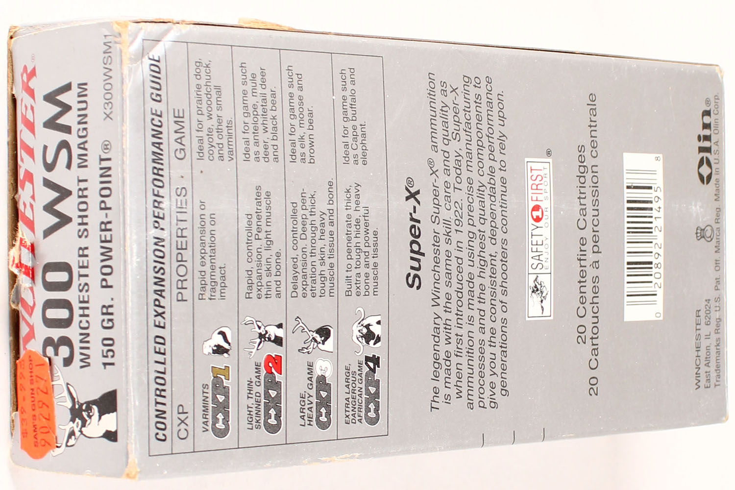 Winchester, Super-X, 300 WSM, 150 Grain Power-Point, Full, 1pc., Multi-colored box, box is solid but has light scuffing on right end flap with great color, Ammo is excellent. Grade: Excellent + - Value: 20 to 80