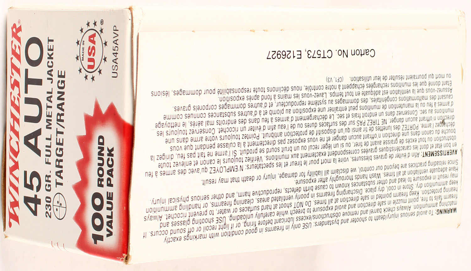 Winchester, 45 Auto, 230 Grain FMJ, FULL & SEALED, 1pc., Multi-colored box, box is solid with great color, Ammo is excellent. Grade: Excellent + - Value: 20 to 80