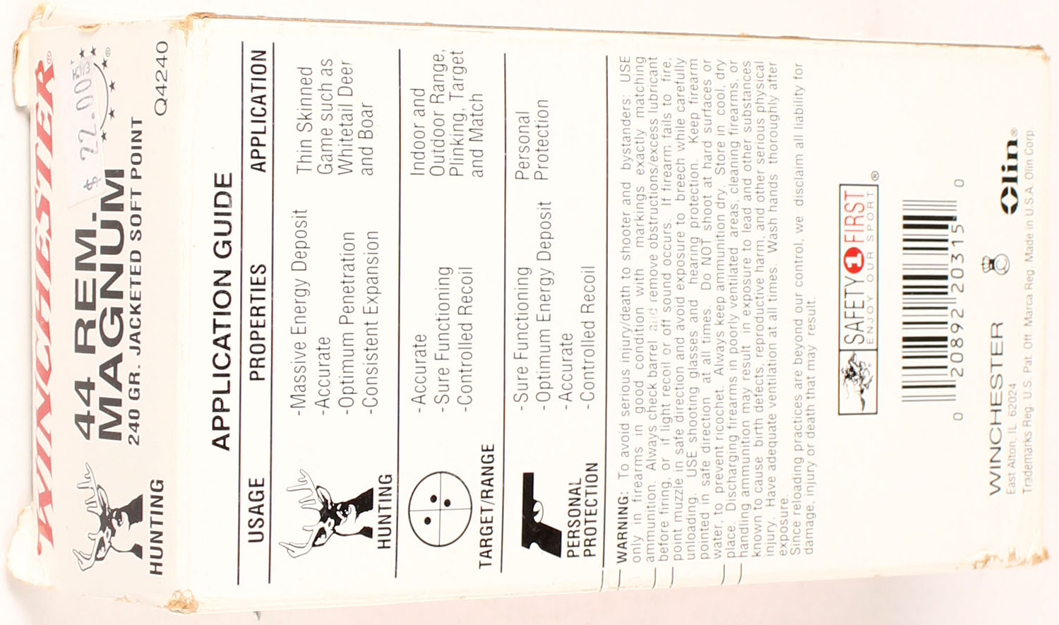 Winchester, 44 Rem Mag, 240 Grain Jacketed Soft Point, Full, 1pc., Multi-colored box, box is solid with great color, Ammo is excellent. Grade: Excellent + - Value: 20 to 80