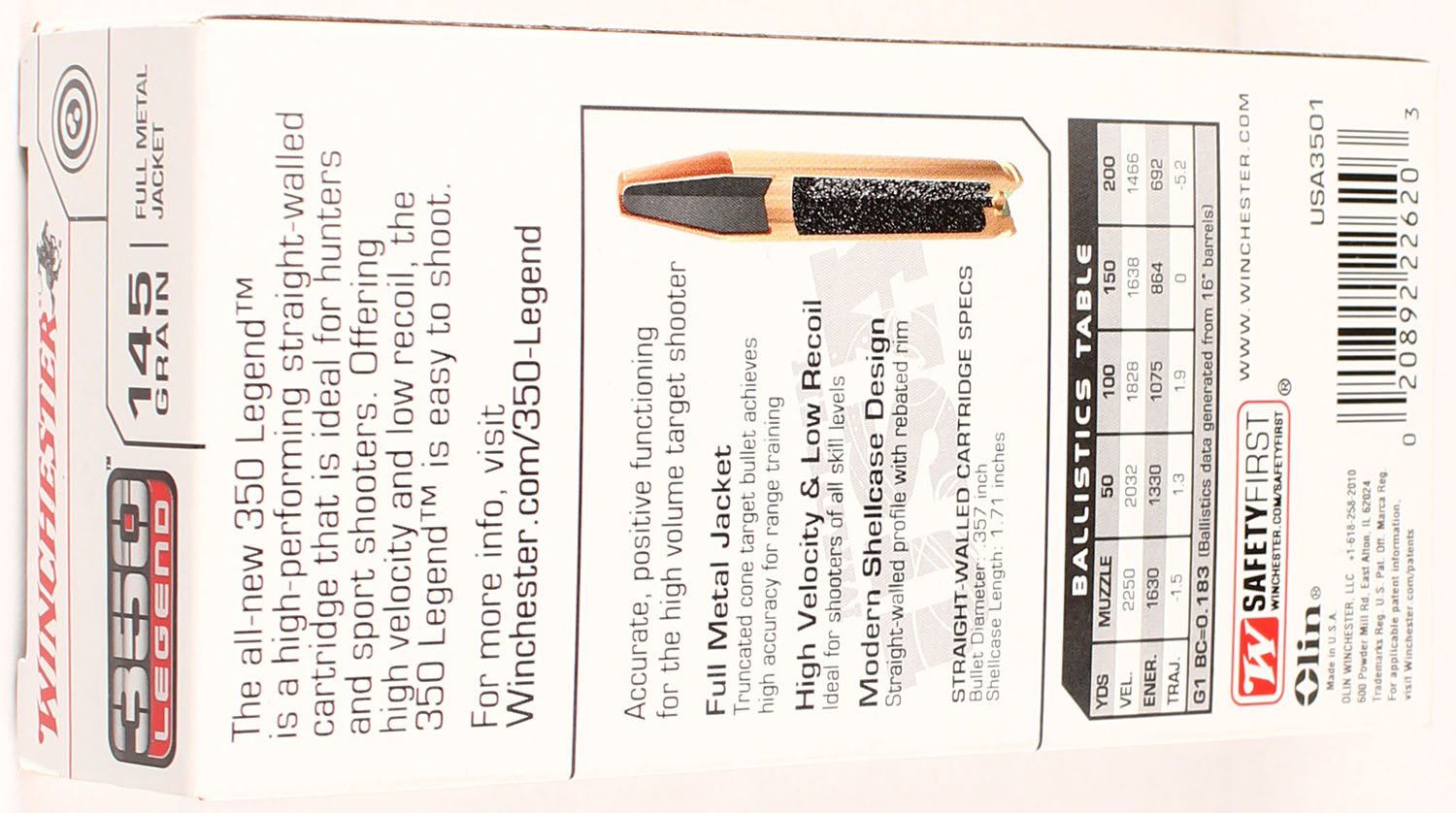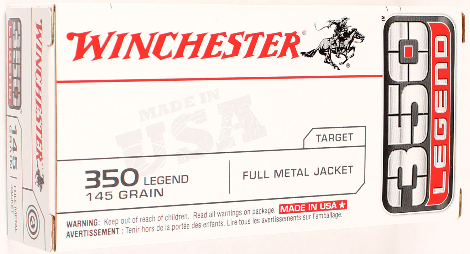 Winchester, 350 Legend, 145 Grain FMJ, Full, 1pc., Multi-colored box, box is solid with great color, Ammo is excellent. Grade: Excellent + - Value: 20 to 80