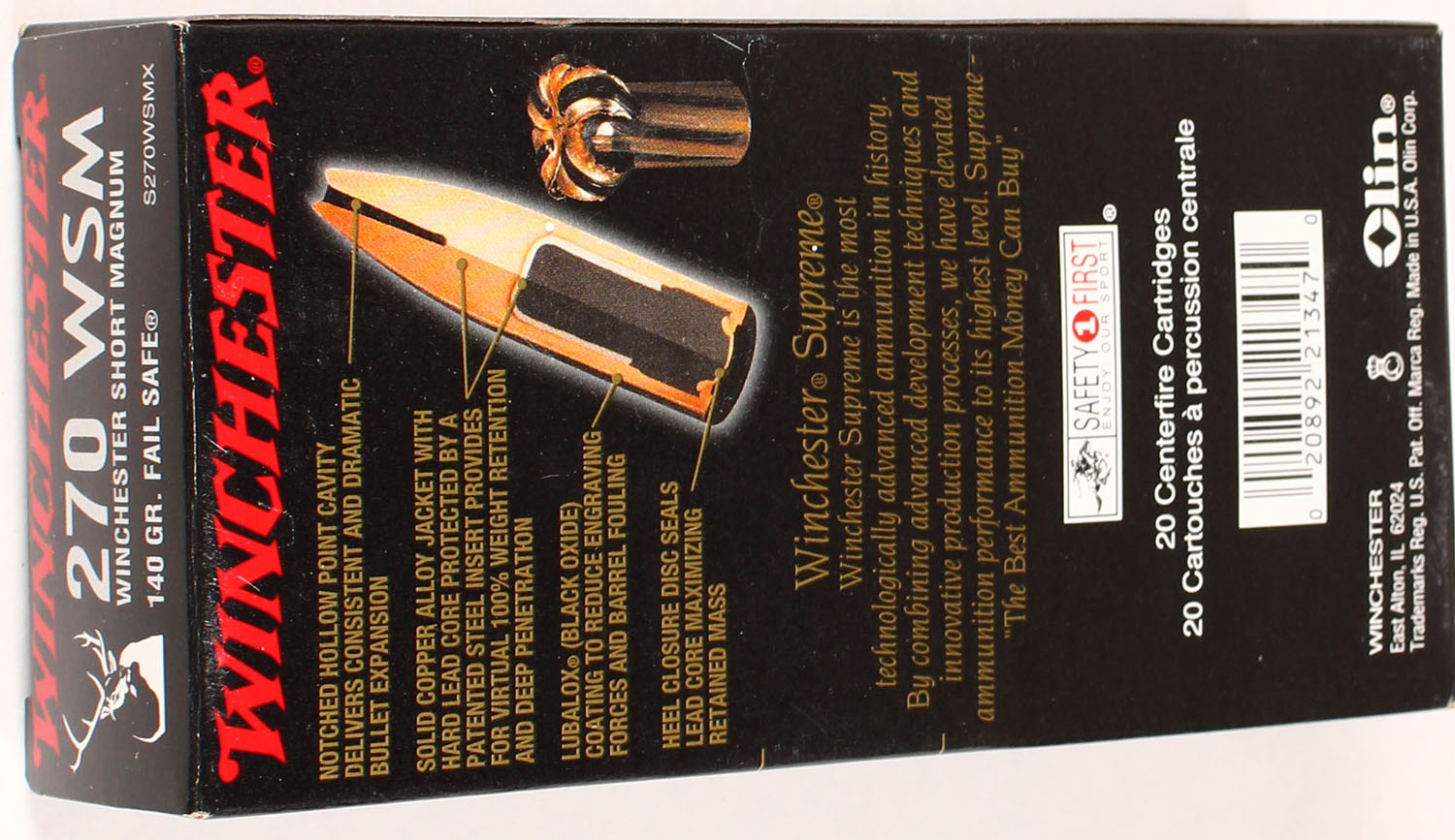 Winchester, Supreme, 270 WSM, 140 Grain Fail Safe, Full, 1pc., Multi-colored box, box is solid with great color, Ammo is excellent. Grade: Excellent + - Value: 20 to 80