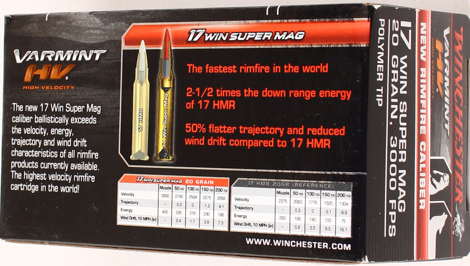 Winchester Elite, Varmint, 17 Win Super Mag, 20 Grain High Velocity Polymer Tip, Full, 1pc., Multi-colored box, box is solid with great color, Ammo is excellent. Grade: Excellent + - Value: 20 to 80