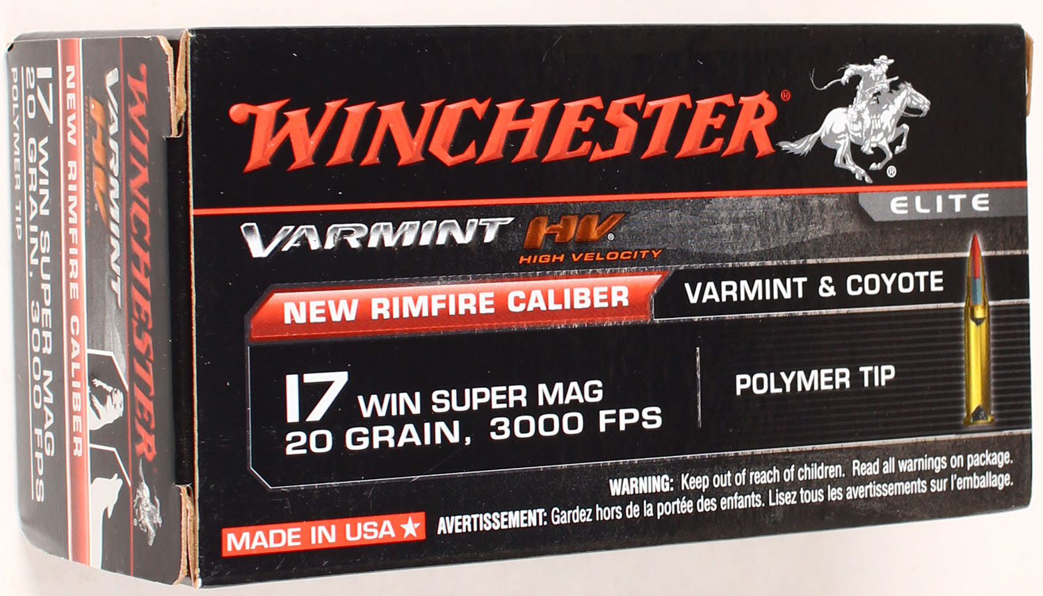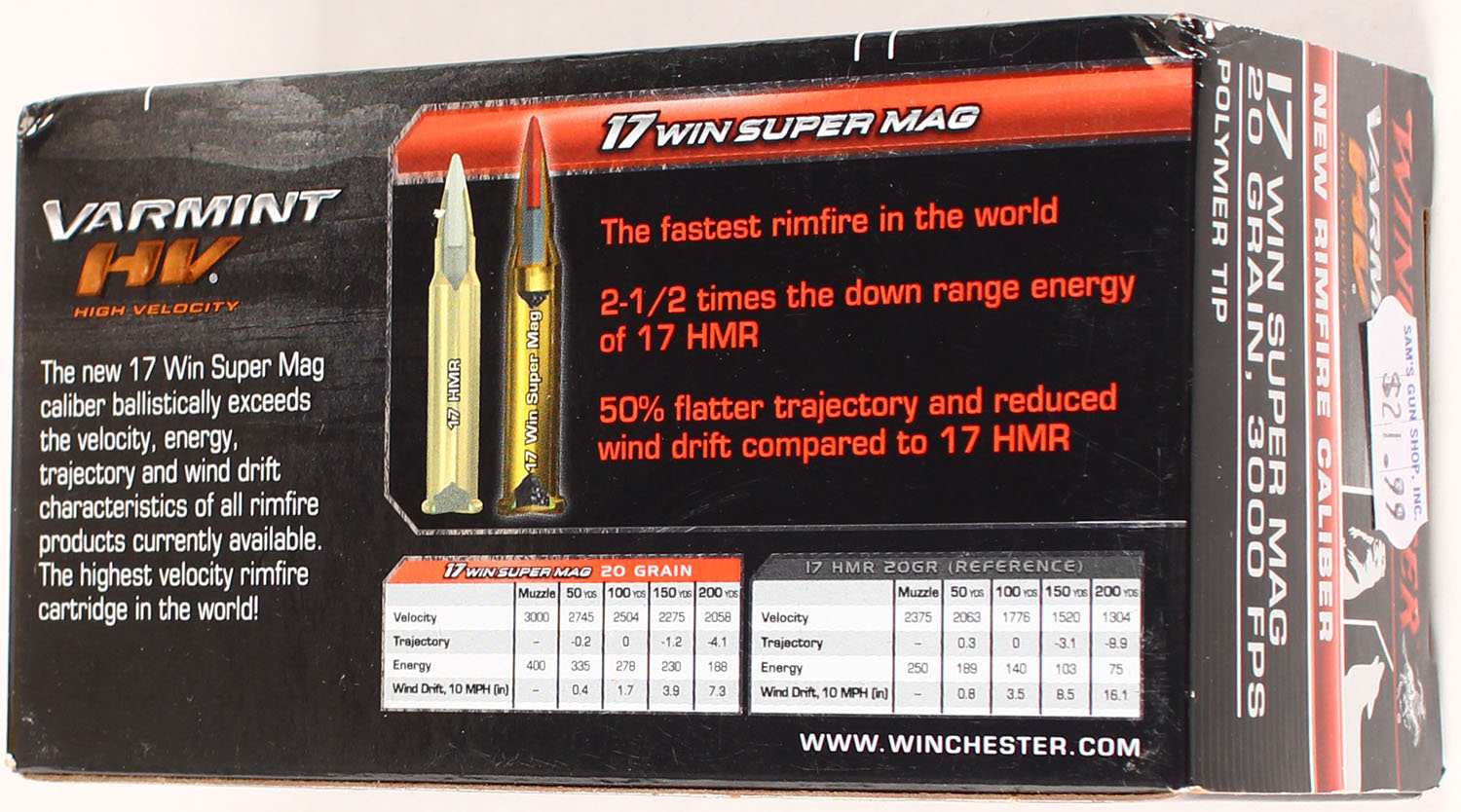 Winchester Elite, Varmint, 17 Win Super Mag, 20 Grain High Velocity Polymer Tip, Full, 1pc., Multi-colored box, box is solid with great color, Ammo is excellent. Grade: Excellent + - Value: 20 to 80