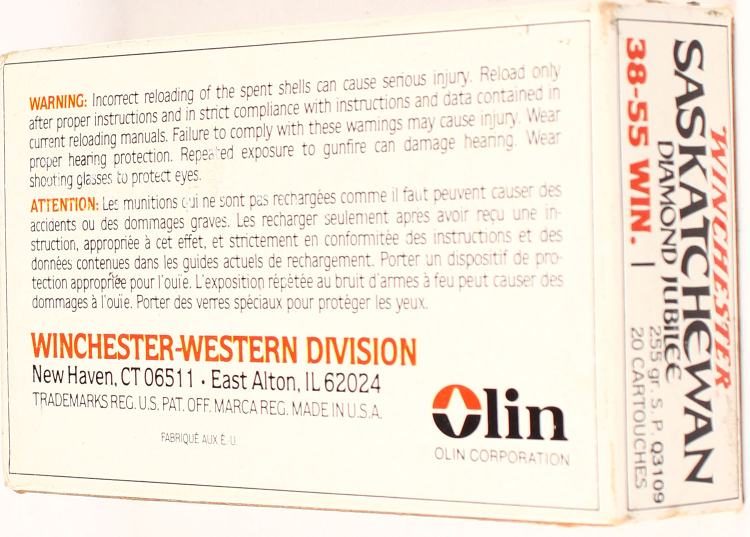 Winchester, Saskatchewan Diamond Jubilee, 38-55 Win, 255 Grain SP, Full, 1pc., Multi-colored box, box is solid with great color, Ammo is excellent. Grade: Excellent + - Value: 20 to 100