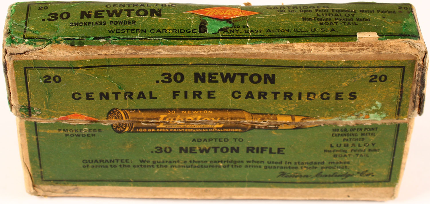 Western, .30 Newton, 180 Gr. Open Point Expanding Metal Patched LUBALOY boat tail pointed bullet, smokeless, 2pc., partial 10 Rds., buff box with green label & black/red print, box is solid with inside seam tape repairs on top box, handling wear, tears on side label, age soiling, rub wear, & edge/corner wear, ammo is good. Grade: Good ++ - Value: 30 to 120
