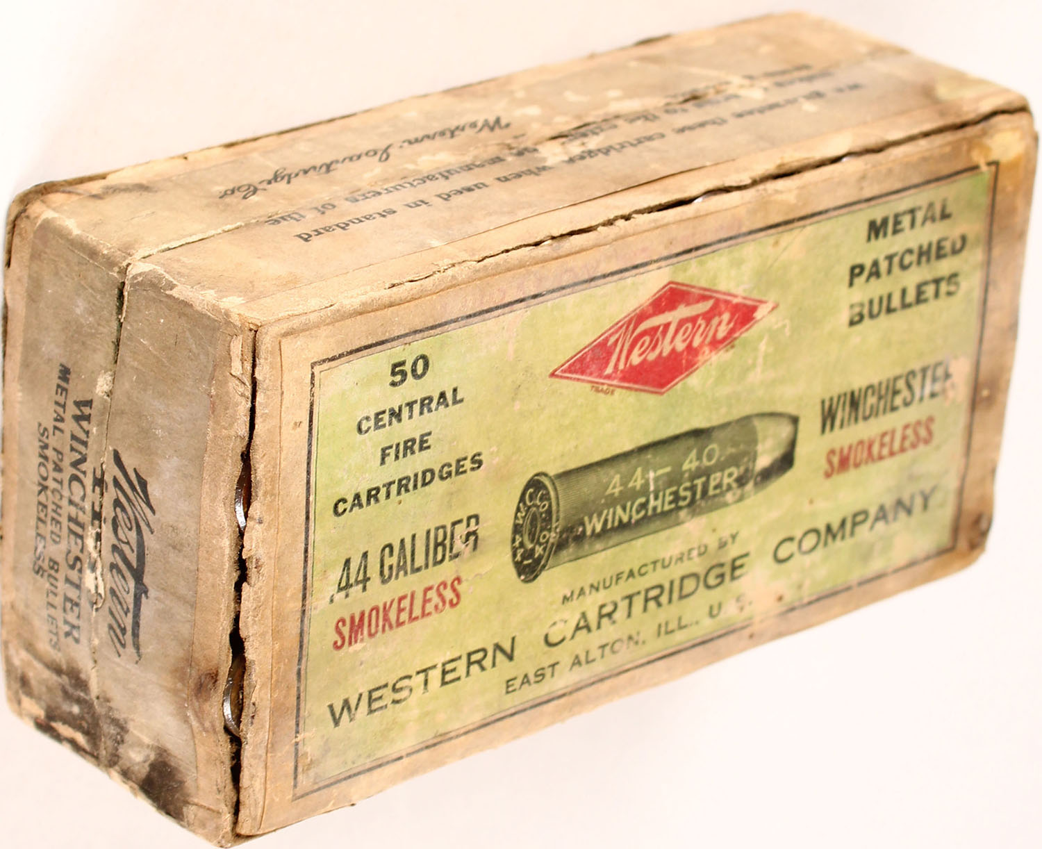 Western, .44-40 Winchester, Metal patched Bullets, Smokeless, 2pc, Full with two soft point bullets, buff box with green label & black/red print, box is weak & has top & bottom seams torn, side seal is still intact, light age soiling, rub marks, & edge wear, ammo is very good. Grade: Fair + - Value: 50 to 200