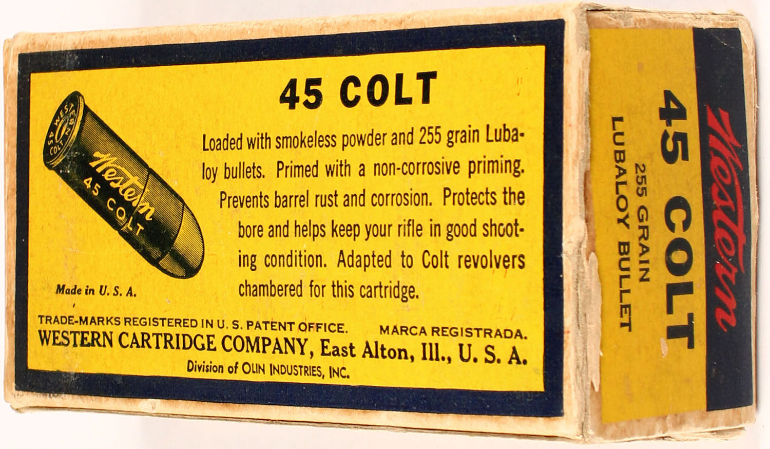 Western, Bullseye, .45 Colt, 255 Gr. LUBALOY Bullet, smokeless, Oilproof, 1pc, Full of modern ammo, buff box with blue/yellow label & black/red print, box has left end flap detached but still present, missing one inside end flap on right side & other inside flap is partially torn, right end flap has inside seam tape repair, pen marks, light rub marks & light edge wear, ammo is excellent. Grade: Very Good + - Value: 20 to 60