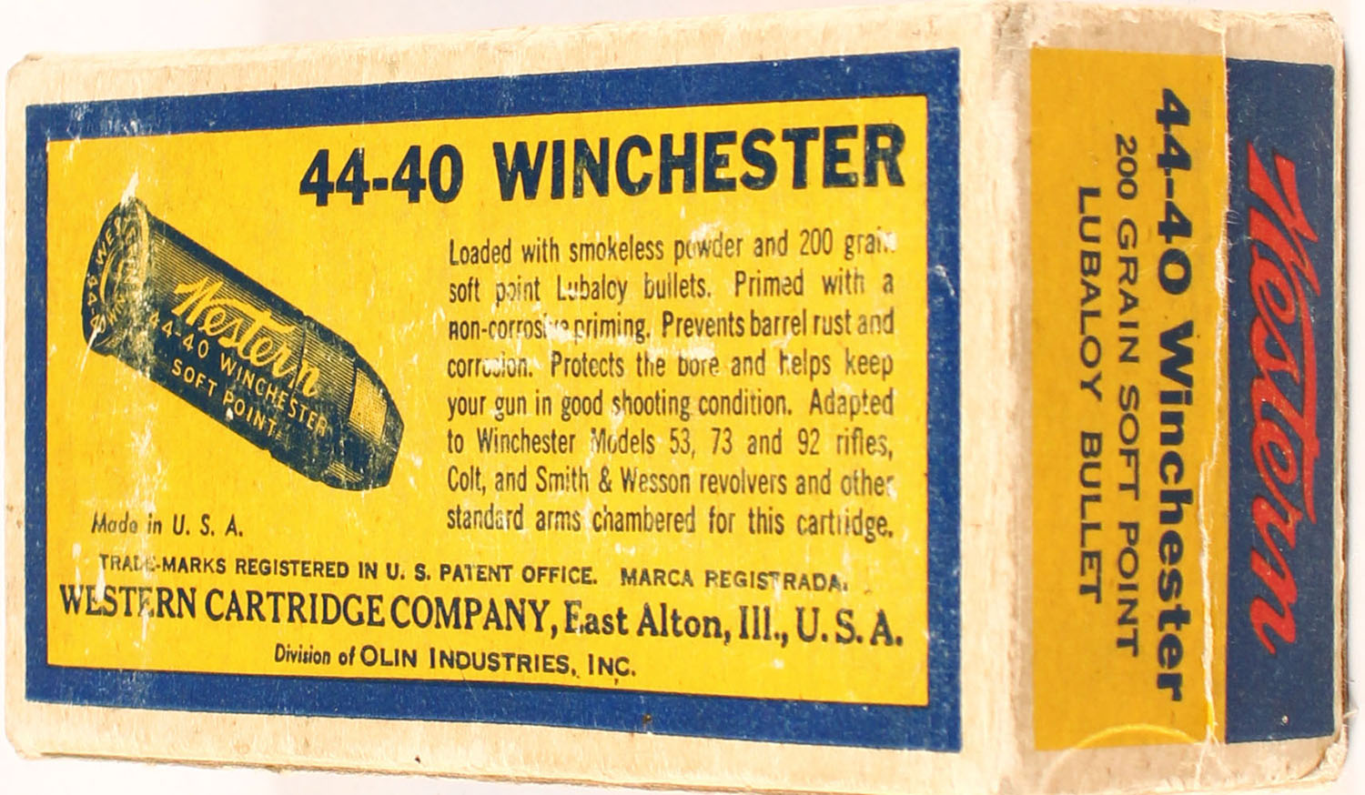 Western, Bullseye, .44-40 Winchester, 200 Gr. Soft Point LUBALOY Bullet, Smokeless, Oilproof, 1pc, Full, buff box with blue/yellow label & black print, box has left end flap detached but is still present, one partial tear in seam, rub marks, pen marks, & edge wear, ammo ranges from excellent to good. Grade: Very Good ++ - Value: 60 to 120