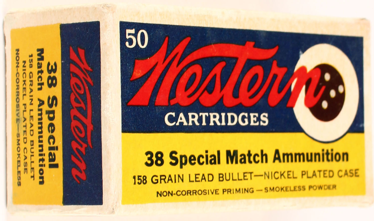 Western, Bullseye, .38 Special Match, 158 Gr. Lead Bullet, Nickel Plated case, Smokeless, 1pc, Full, white box with blue/yellow label & black/red print, box is solid with light rub marks, & light edge wear, ammo is very good. Grade: Excellent + - Value: 20 to 100