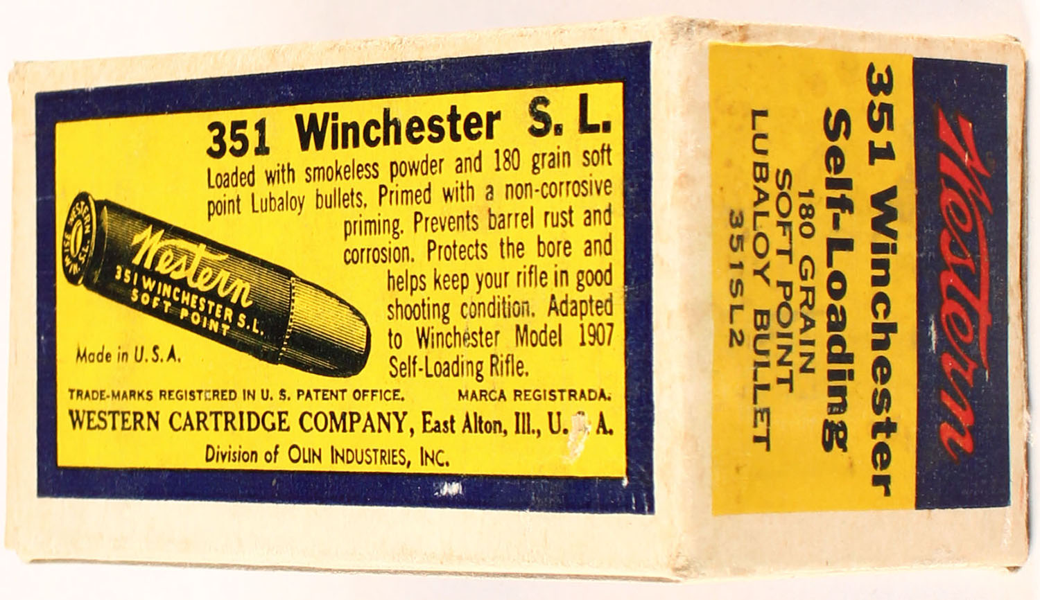 Western, .351 Winchester S.L., 180 Grain Lubaloy Bullet, FULL, 1Pc., Blue yellow & red bulls eye box, box has some scuffing, ammo is excellent. Grade: Excellent - Value: 100 to 300