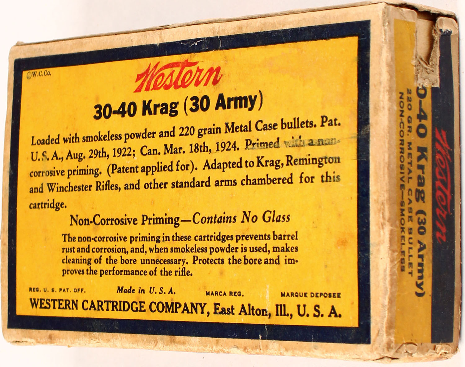 Western, .30-40 Krag(.30 Army), 220 Grain Lubaloy Bullet, FULL, 1Pc., Blue yellow & red bulls eye box, box has age soiling and some scuffing, both flaps are torn, ammo is very good. Grade: Good ++ - Value: 10 to 50