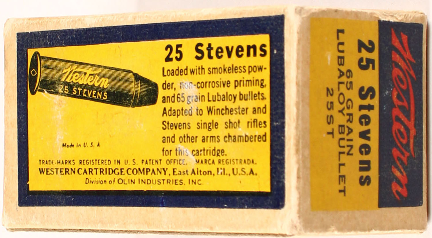 Western, .25 Stevens, 65 Grain Lubaloy Bullet, FULL, 1Pc., Blue yellow & red bulls eye box, box is solid, ammo is excellent. Grade: Excellent - Value: 50 to 150