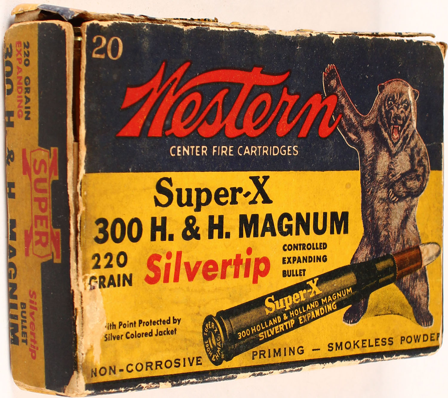 Western, Super-X, .300 H&H. Magnum, 220 Grain Silvertip Bullet, Controlled Expanding Bullet, Full, 1pc. Yellow blue & red Bear Box, box has scuffing, torn flaps and tears to box, edge & corner wear, ammo is excellent. Grade: Good - Value: 16 to 60