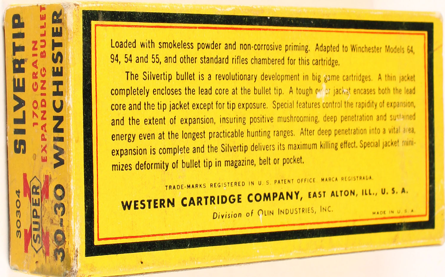 Western, Super-X, .30-30 Winchester, 170 Grain Silvertip Bullet, Controlled Expanding Bullet, Full, 1pc. Yellow blue & red Box, box has light scuffing, ammo is excellent. Grade: Excellent - Value: 30 to 90