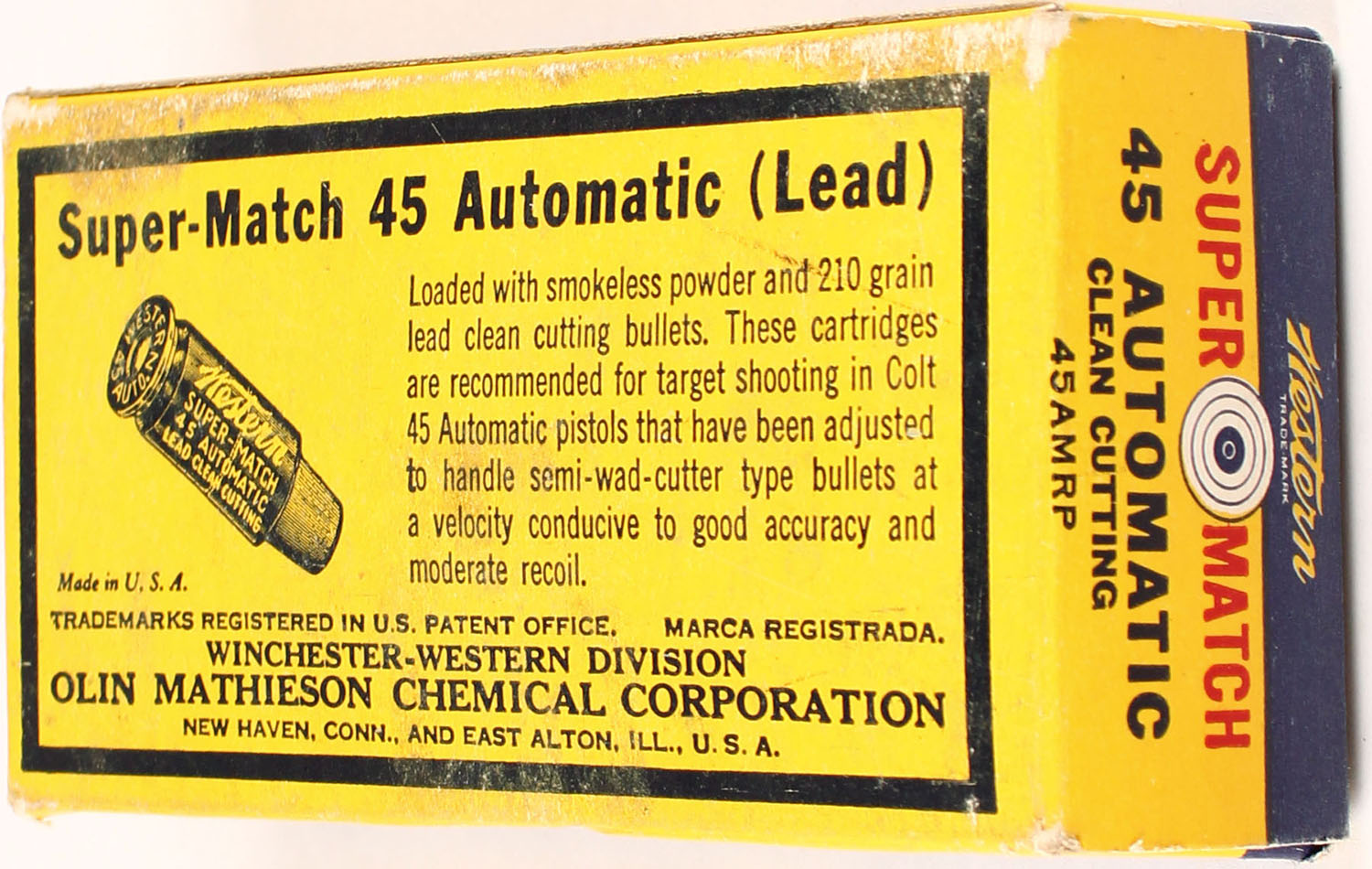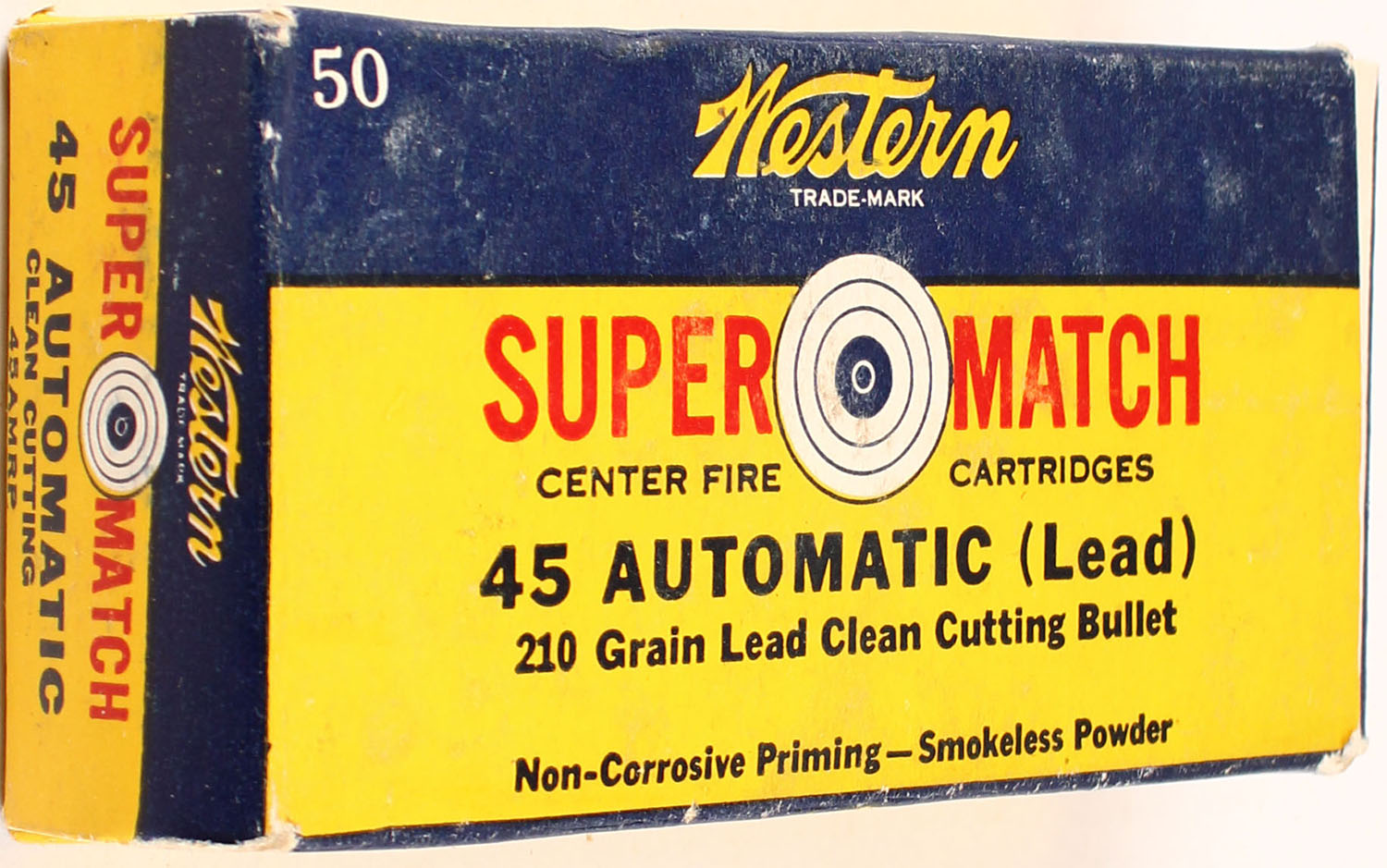 Western, Super Match, .45 Automatic, 210 Grain, Full, 1pc. Yellow blue & red Box, box has scuffing, ammo is mint. Grade: Excellent + - Value: 40 to 100