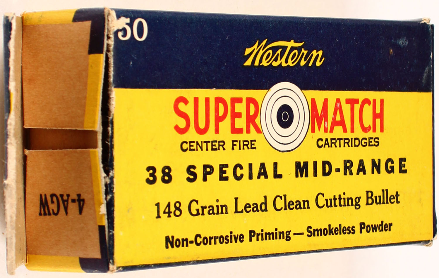 Western, Super Match, .38 Special Mid-Range, 148 Grain, Full, 1pc. Yellow blue & red Box, box 1 torn flap, minor scuffing, ammo is excellent. Grade: Excellent - Value: 40 to 150