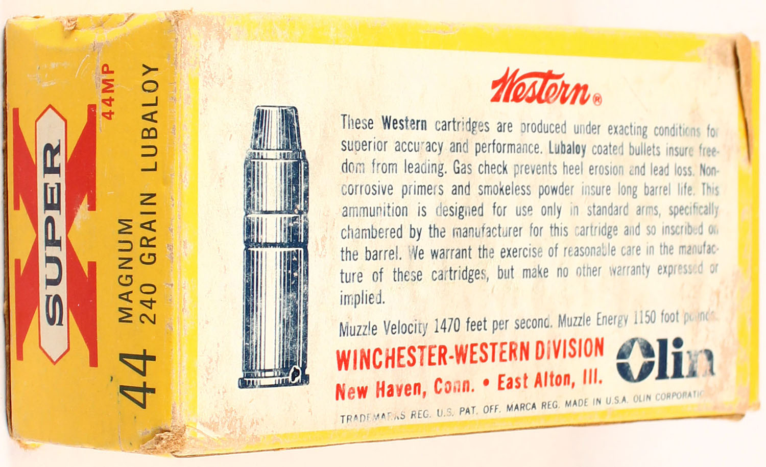 Western, Super-X, .44 Magnum, .240 Gr. LUBALOY, Inside Lubricated, Gas Check Bullet, 1pc, Full, yellow box with white label & black/red print, box is solid with rub marks, edge wear, sticker marks, & pen marks, ammo is very good. Grade: Very Good + - Value: 30 to 60