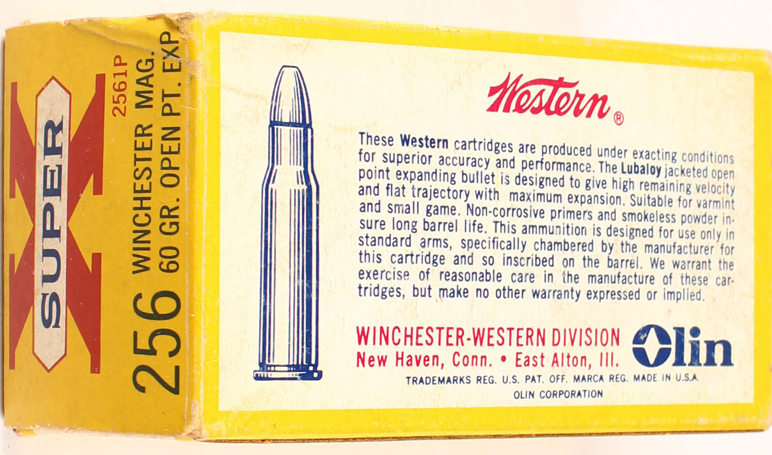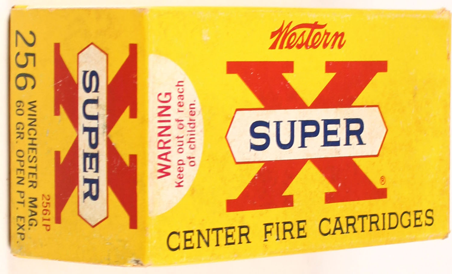 Western, Super-X, .256 Winchester Mag., 60 Gr. Open PT. EXP. Bullet, 1pc, Full, yellow box with white label & black/red/blue print, box is solid with light rub marks, light age soiling & light handling wear, ammo is excellent. Grade: Excellent - Value: 100 to 200