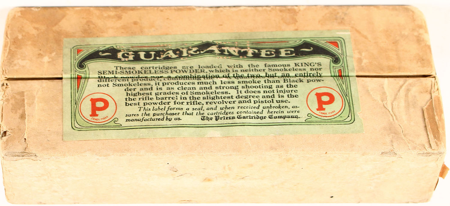 Peters, .45-70-405 Gov't, Semi-Smokeless Powder, 2pc, FULL & SEALED, buff box with blue label & black print, box is solid with two tears in top label, light rub wear, light edge wear, & light age soiling. Grade: Very Good ++ - Value: 50 to 100