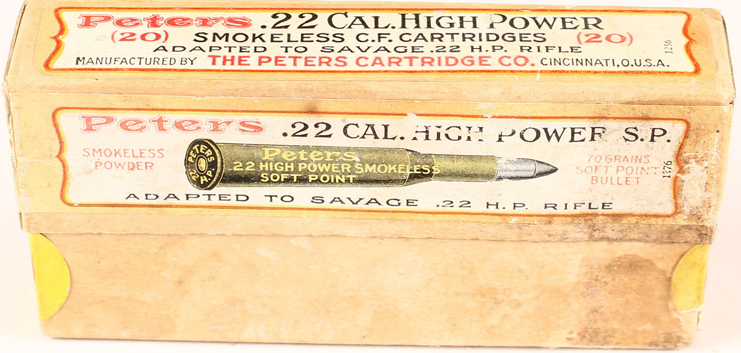 Peters, .22 High Power, 70 Gr. Soft Point Bullet, Smokeless Powder, 2pc, FULL & SEALED, buff box with white/red/yellow label & black print, box is solid with light age soiling, & light rub wear. Grade: Excellent - Value: 150 to 300