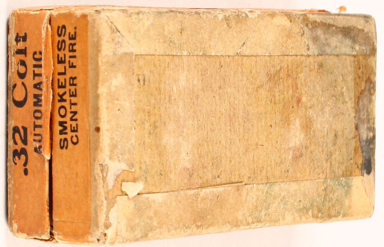 Peters, .32 Colt Automatic, Metal cased Bullet, Smokeless Powder, 2pc, Partial 40 Rds. With mixed H/S, buff box with salmon/orange label & black print, box is solid with four corner seam tears on lid, tear in top label, light age soiling, light rub marks, & edge wear, ammo is very good. Grade: Very Good + - Value: 20 to 60