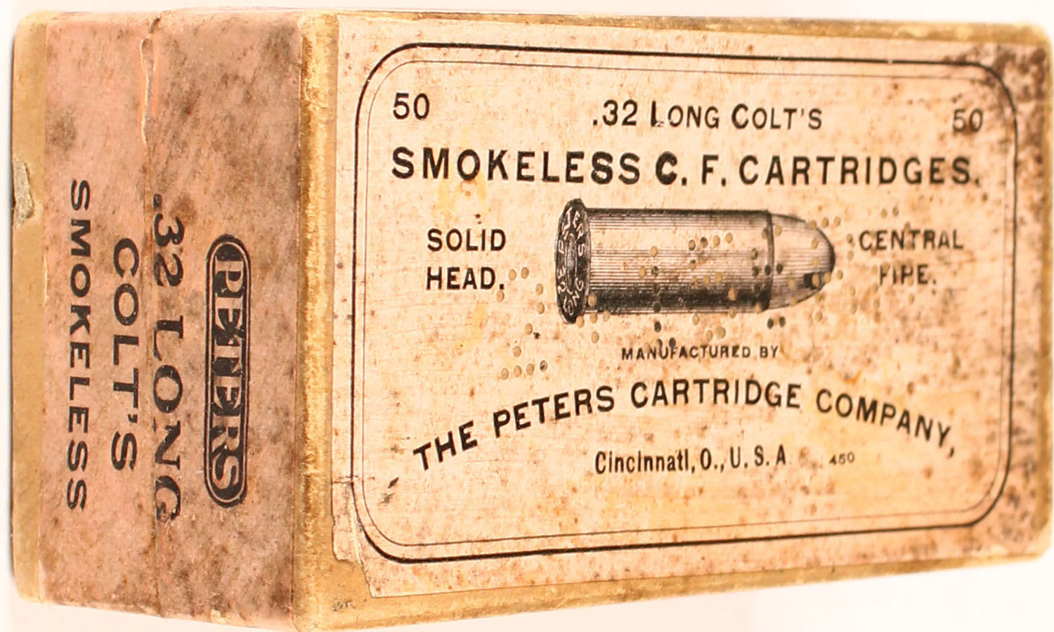 Peters, .32 Long Colt, Smokeless, Solid Head, 2pc, FULL & SEALED, buff box with salmon label & black print, box is solid with age soiling, light rub marks & light edge/corner wear. Grade: Very Good ++ - Value: 14 to 90