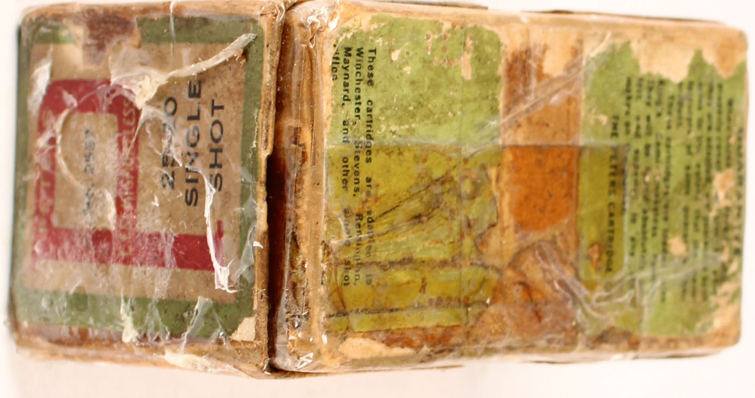 Peters, .25-20 Single Shot, Semi-Smokeless Powder, 2pc, Full, buff box with green/white/red label & black print, box is solid with tape all over box, light age soiling, light rub marks & edge wear, ammo is very good. Grade: Very Good - Value: 100 to 200