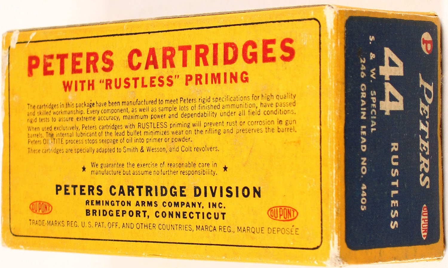 Peters, Rustless, .44 S.&W. Special, 246 Gr. Lead Bullet, Smokeless, 1pc, Full, yellow box with blue/red label & white print, box is solid with rub wear, & light edge/corner wear, ammo is excellent. Grade: Excellent + - Value: 30 to 60