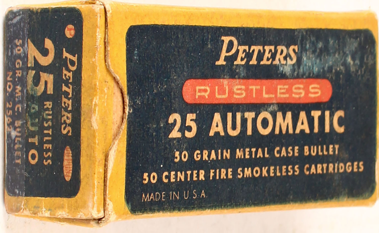Peters, Rustless, .25 Automatic, 50 Gr. Metal cased bullet, smokeless, 1pc, partial 40 Rds., yellow box with blue/red label & white print, box is solid with light age soiling, rub marks, & light edge wear, ammo is very good. Grade: Very Good ++ - Value: 14 to 90